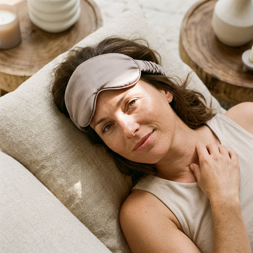 Onze verzwaarde slaapmasker helpt je met loslaten en slapen. Het masker begeleidt je lichaam naar rust met zachte druk en totale duisternis, zonder dat jij iets hoeft te doen.